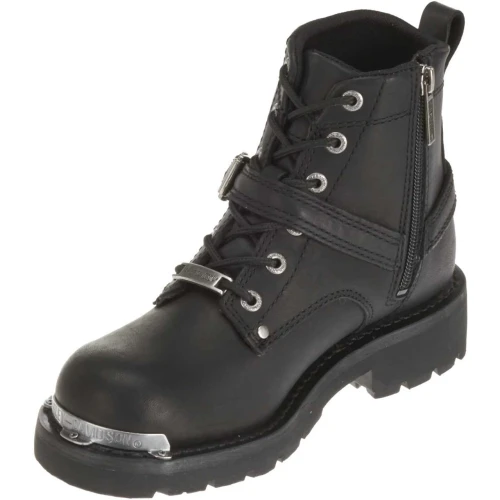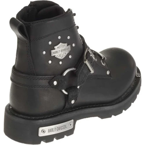 - Designed with a round toe, front strap with Harley® buckle and a back strap, both attached to a side O'Ring, metal badges on the toe, bottom lace, and heel, with a Harley-Davidson® Bar & Shield badge on the side
