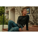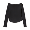 Off-the-shoulder neckline. Thumbholes at cuffs. Shirttail hem.