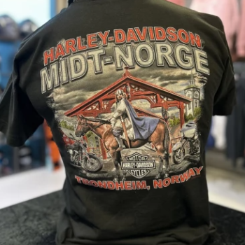 T-skjorte med Harley-Davidson Midt-Norge logo på ryggen.