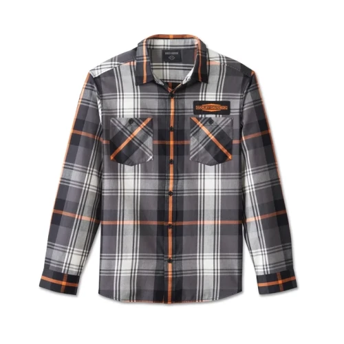 Our iconic colors merge with longwearing comfort on the Stacked Bar & Shield Long Sleeve Plaid Shirt. Made from durable yet lightweight cotton twill that’s washed for softness and a well-worn feel. This men’s button down features a shirttail hem that looks great tucked in or out, a pen stall on the chest pocket, and a hidden snap-down collar that stays put under riding gear. The plaid pattern is an ideal backdrop for the stacked Bar & Shield patches on both sides. Our featured logo here dates back to 1963 when it was extended horizontally to better fit our motorcycle gas tanks.