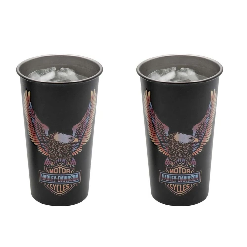 Set of two 16 oz. / 480 ml black stainless steel cups. Bar & Shield Eagle logo turns from white to vivid colors when cold liquid is added! Hand wash only.