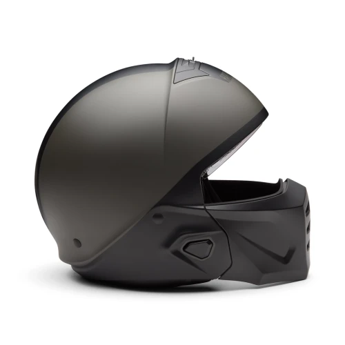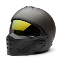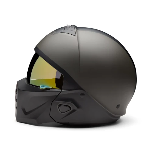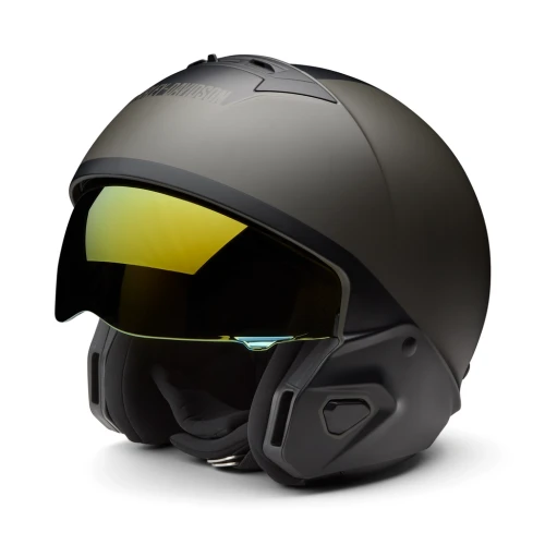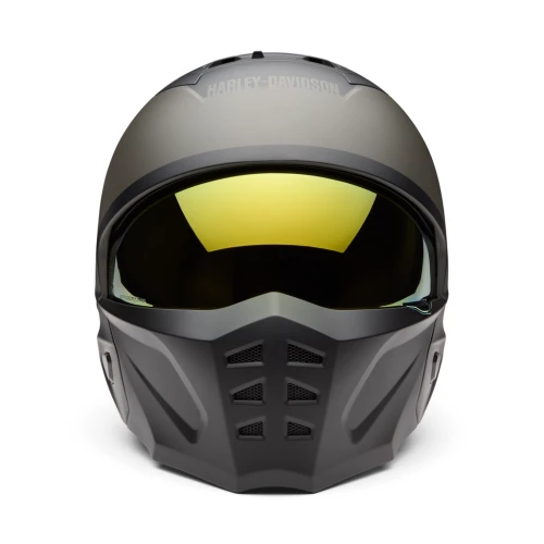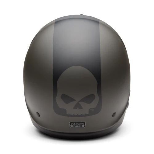 Allsidig 3/4 motorsykkelhjelm som kan brukes både med og uten hakebeskytter. Hjelmen har god ventilasjon, nedfellbart gullspeil-visir og komfortabelt, avtakbart innerfôr. Matt Harley Black / Black Olive finish med ikonisk Willie G Skull-design.