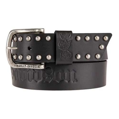 - Features a beautiful studded design with embossed roses and Harley-Davidson script