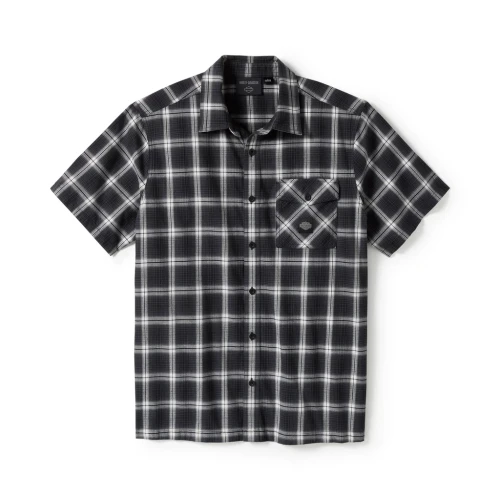 Easy-breezy plaid style gets an H-D upgrade on our Staple Short Sleeve Shirt. It’s cut for longwearing comfort from breathable yet durable all-cotton twill that’s peached for softness. This men’s button down features a button-closed chest pocket plus a hidden snap-down collar that stays put under riding gear. Our woven label graces the front for a lowkey Harley-Davidson look.