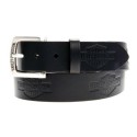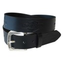Genuine Black Leather Belt. Features Embossed Long Bar & Shield Logos. Interchangeable Buckle. Width: 1 1/2''